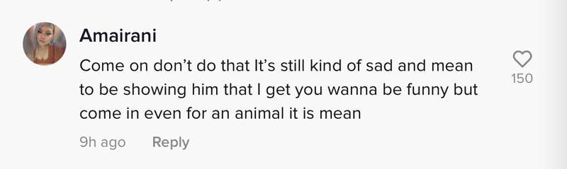 "Come on don't do that," one commenter wrote. "It's still kind of sad and mean to be showing him that. I get you wanna be funny but come (on) even for an animal it is mean."