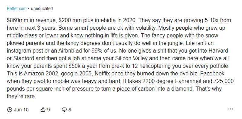 Later in the same thread, uneducated weighed in to defend Better.com. After flouting claims about its revenue and growth, uneducated wrote, "Some smart people are ok with volatility. ... The Fancy people with the snow plowed parents and the fancy degrees don't usually do well in the jungle."